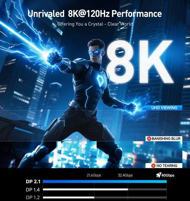DisplayPort Compatibility: DisplayPort 2.1 cables are compatible with older DP devices and ports / Backward compatible with DisplayPort 2.0, 1.4, and 1.2