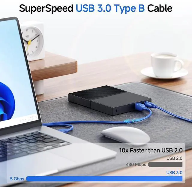 Broad Compatibility with Popular Devices: The USB 3.0 Type B cable is compatible with Fujitsu ScanSnap iX500 scanner, Dell S2340T monitor, Dell USB 3.0 docking station, HP USB 3.0 port replicator, and Western Digital (WD) and Seagate desktop USB 3.0 external hard drives equipped with a Type-B USB 3.0 port.