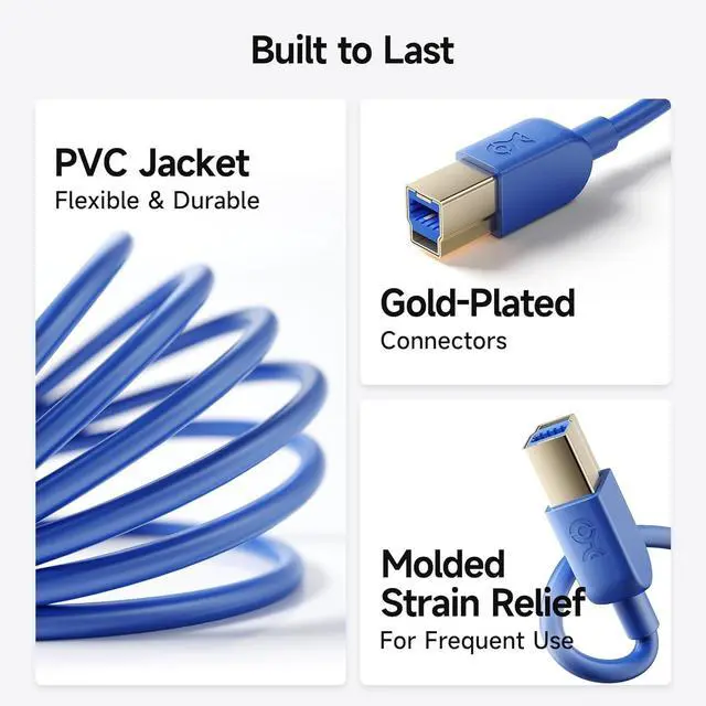 Enhanced Durability and Easy Use: This USB B to USB A cable is engineered with molded strain relief connectors for extra durability, while the grip treads make it easy to securely plug and unplug without hassle.