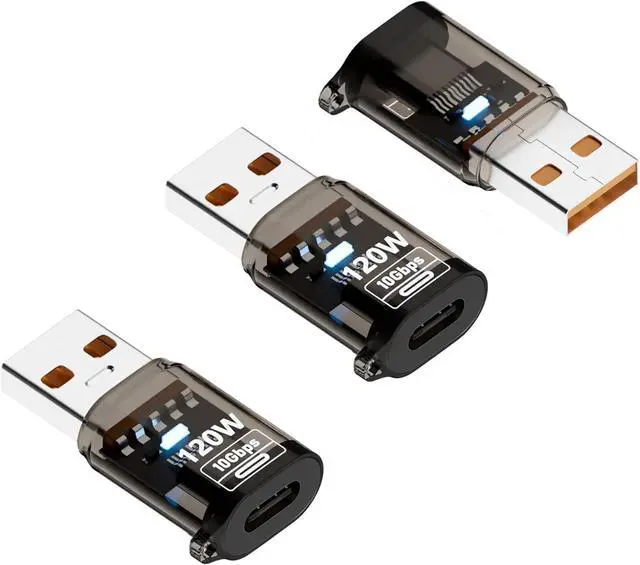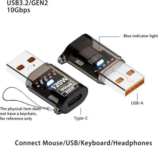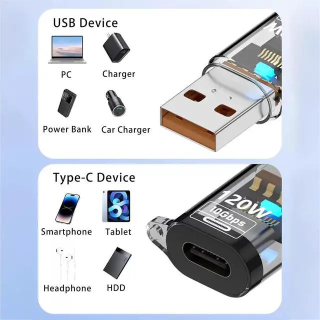 (NOTE: USBC to USB Adapter Only single-sided support 10Gbps transmission speed. If the transmission speed is not enough during use please flip the Type C female 180 degrees and reinsert it. )BROAD DEVICE COMPATIBILITY Use this USB A male to USB C female adapter to connect mice keyboards headsets hard drives and other USB-A accessories to modern USB-C hosts. 120W FAST CHARGING SUPPORT Enable high-speed power delivery up to 120W with this female USB C to male USB A adapter (requires a compatible PD-enabled power source) providing rapid charging for phones tablets and compatible devices.? SMART CONNECTION INDICATOR Features a built-in LED light for clear status monitoring making this USBC to USB adapter user-friendly and operationally transparent. COMPACT AND DURABLE DESIGN Designed for portability and daily use this USB C female to USB male adapter offers a reliable travel-ready solution for both home and mobile setups.