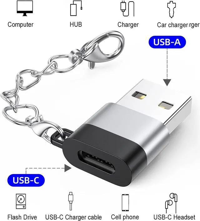 Keychain DesignCompact portable keychain usb-c female to usb male adapter design for anti-lost and easy-to-find. You can buckle the adapter on the key for using at anytime. 18W Charging & 480Mbps Data Transfer SyncThis usb c female to usb adapter using USB 2.0 technology supports data speed up to 480Mbps and supports 18W fast charging making your work efficiency one step faster. Universal CompatibilityThe male usb to female usb c adapter compatible with charger cables for iPhone 16 series/15 series Galaxy S24/23/22/S21/S20 etc. Multiple FunctionsThe usb c connector can hook up any USB-C peripherals (USB C charger cable Type-C headphones flash drive card reader etc) via connecting USB port.