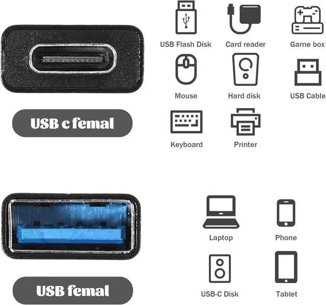 Package ContentsYou will receive 5 PCS of USB C Female to USB A Female Adapter and 2 OTG Adapter. Each adapter is designed for reliability and durability ensuring long-term useDurable ConstructionThe USB C to USB A Female Adapter features a robust alloy shell providing excellent oxidation resistance and heat dissipation. Its compact design makes it easy to carry without adding bulk to your accessoriesFast Data TransferThis USB C Female to USB Female Adapter supports up to 10 Gbps data transfer ensuring high-speed connectivity between devices. The adapter is compatible with USB 3.1 Gen 2 making it ideal for transferring large files quickly and efficientlyPlug and PlayThe USB C Female to USB Female Adapter requires no additional software or drivers.