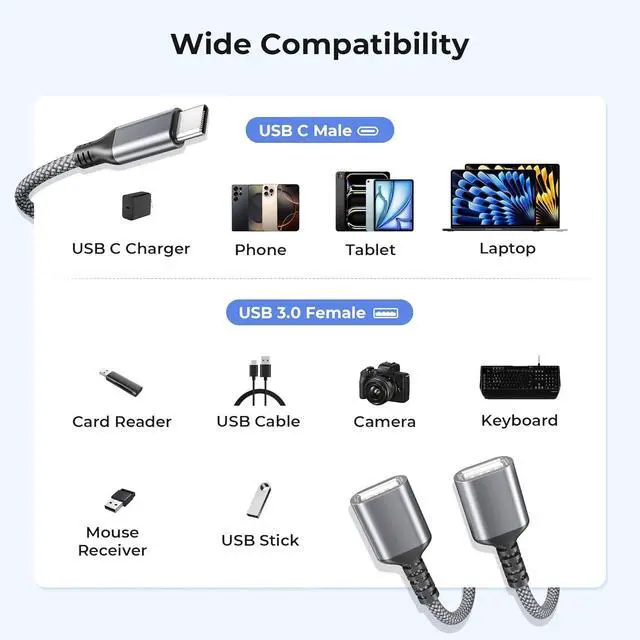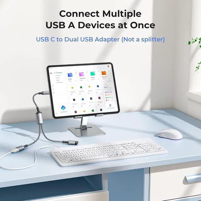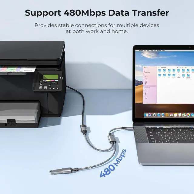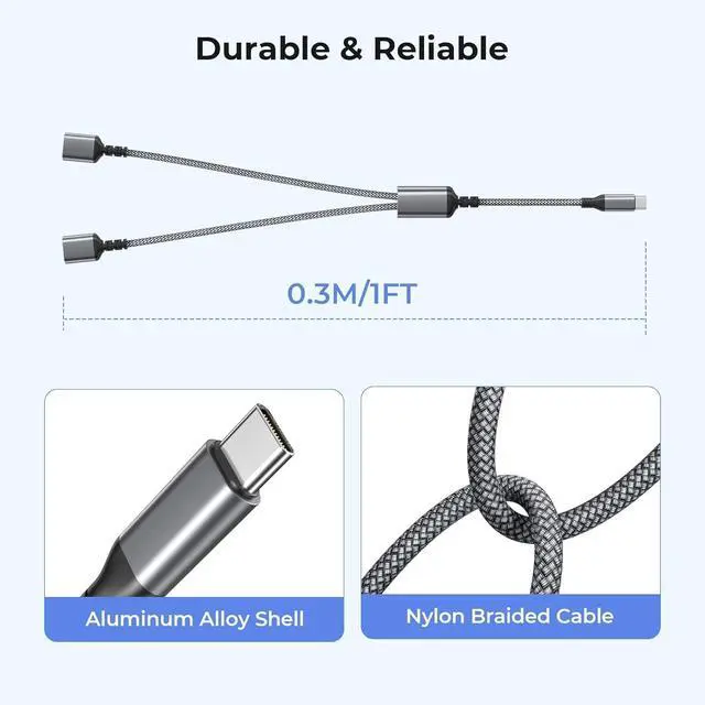 (Notice: This is a USB 2.0 splitter). (Less Chaos More Order) Need to simultaneously connect to your accessories like keyboard and mouse but don't want too many cables messing up your working space? Now you can. This USB-C to dual USB Adapter makes it possible to connect to two devices with one single cable so that you are free from all the hassle of two tangled cables. (Less Wearing More Saving) Tired of your wallet constantly getting worn and becoming thinner along with the wearing of other shoddy splitters? With double-braided nylon and aluminum casing that are not sensitive to twists and bends this cable can last longer than you can imagine. (Less Confusion More Concentration) With no need to download and install extra drive you can simply plug this splitter in your device and start using it right away. No confusing configuration no time-consuming adjustments. It's easy to stay focused with this USB cable.