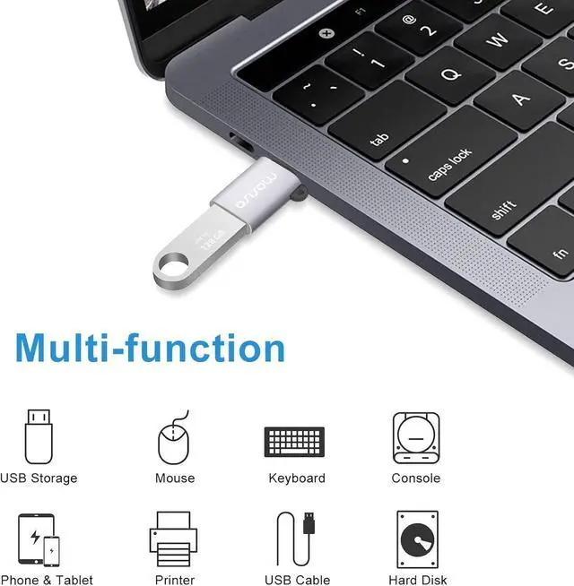 Compact dimension: 1.18 x 0.5 x 0.3 inch. 3 pack per set. As our most considerate design 1 anti-lost rope is included for easier carrying. Our USB C to USB adapter fits laptop/Notebook/tablet/Phone with USB Type C port. Compatible with MacBook Air after 2018; compatible with MacBook Pro after 2016; compatible with iPhone 15/15 Plus/15 Pro/15 Pro Max; compatible with most of the laptops PC tablets and smartphones with a USB Type C port; compatible with other devices with USB Type C port. Plug the adapter USB Type-C end into laptop USB-C port then connect another female USB 3.0 port to standard USB-A device such as mouse keyboard SSD flash. Support OTG function to load USB flash disk directly. This USB-C to USB-A connector also support synchronous charging to your phone and tablet with data transfer speed up to 5.0G bps. This Type C to USB 3.0 converter is made of Aluminum alloy with baking finished surface. Smooth but scratchproof. It will not affect Wifi signal cause heat issue.