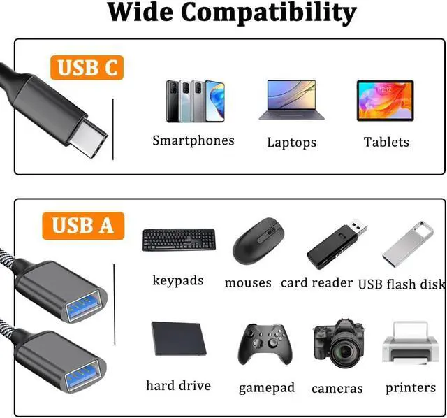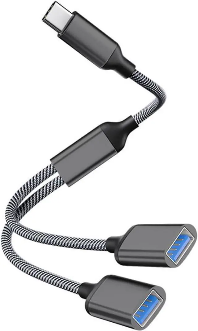 This USB C Male to Dual USB Female Adapter turns one USB-A port into two USB-A port It could connect two of your USB-A devices at the same time. Transferring the data and charge for your two devices at the same time. The transmission speed of the Type C to Two USB A 2.0 Adapter is up to 480Mbps It could transfer data of the high-speed for your device. Transferring the large filesin just a few seconds! Charging support up to 5V2A 10W. Universal Compatibility. The Dual USB Port Hub is widely compatible with most smartphones laptops tablets game consoles USB flash disks.