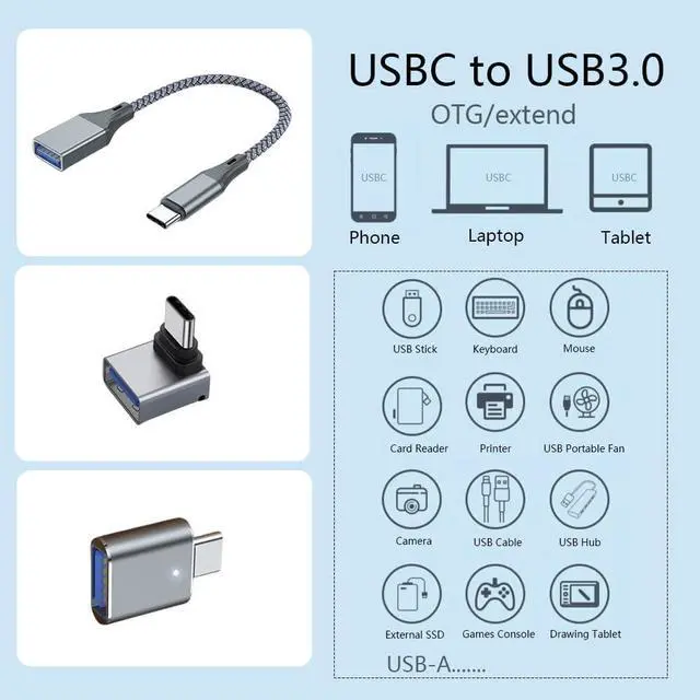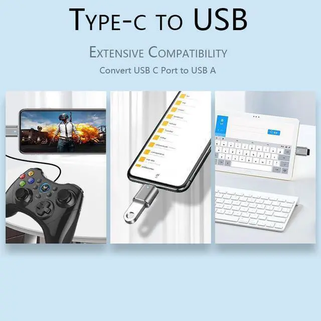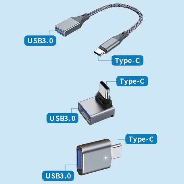 3Pcs Upgraded1. Curved shape2. Straight type3. Line type (Easy to Use) Turn the USB-C ports of any of your devices into USB-A ones with this pack of OTG adapters and give them the necessary interface to interact with your heritage devices that feature USB-A connection. Simply insert the USB-C plug into the corresponding port of your device and you are all set up. Gender Changers (Minimalist Design Maximum Utility) Coming with a slim figure that won't block the port next to the one it's plugged into you can easily plug two of these adapters side by side into two adjacent USB-C ports and achieve maximum efficiency.