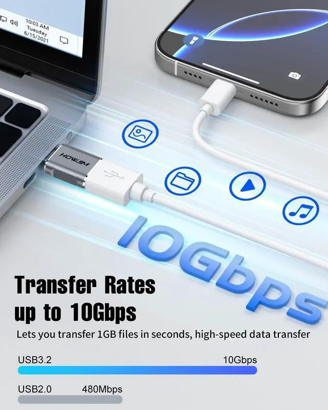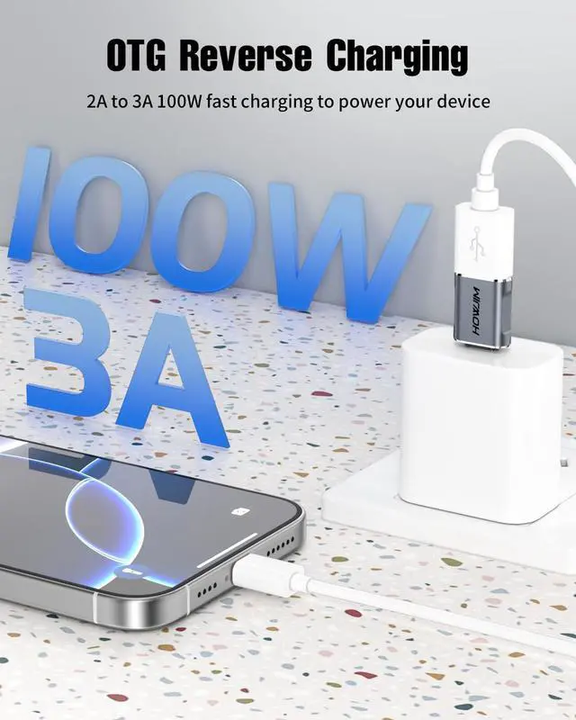 PD Fast ChargingThis usb to usb c adapter supports 100W ( 2.1A - 3.1A ) fast charging for laptops smartphones tablets and other devices. It also features OTG reverse charging and OTG functionality enabling convenient and quick connections to peripherals like keyboards mice USB drives and game controllers. 10Gbps High-Speed Data TransferThis usb c to usb adapter features a USB 3.2 port with transfer speeds up to 10Gbps enabling seamless transfer of 1GB files in seconds. Actual transfer speeds may vary depending on cable and device compatibility.