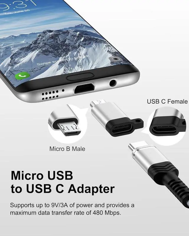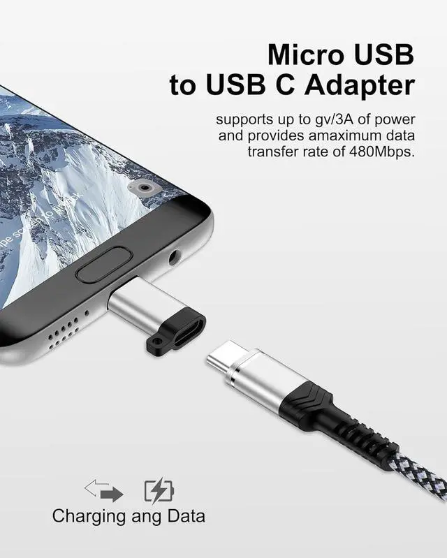 [Charge & Sync with Ease] USB C to Micro USB adapter (2-pack) supports fast charging up to 3A and reliable data transfer speeds up to 480Mbps. Perfect for powering up your Micro USB devices like smartphones tablets power banks and Bluetooth accessories without carrying extra cables. (Not for OTG video output or USB-C headphones. )[Upgraded Durability] Built with a premium aluminum alloy shell and reinforced usbc to micro usb adapter each adapter has passed 9 000+ plug-and-unplug tests. Unlike flimsy alternatives it maintains a secure stable fit over timeno more loose connections or quick wear-out.
