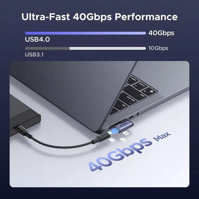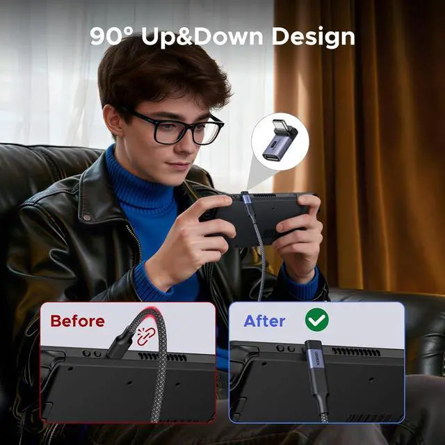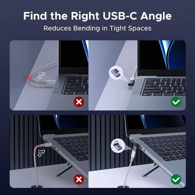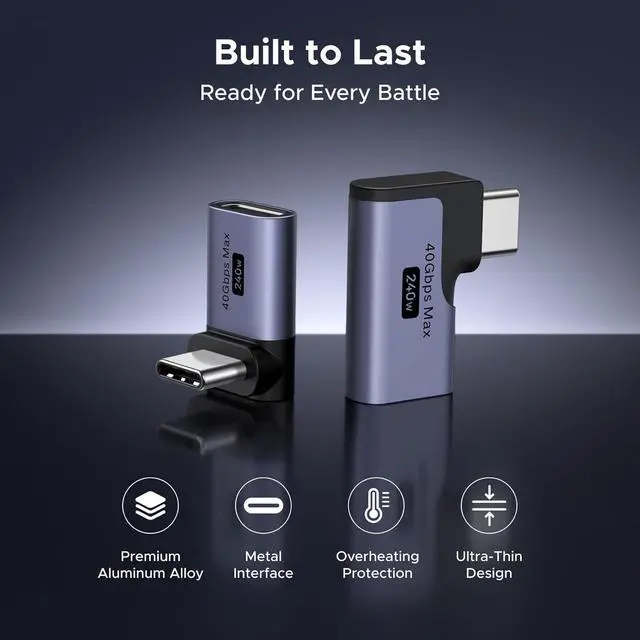 Every Scenario: The USB C 90 Degree Adapter includes a top/bottom and left/right-90 degree adapter offering flexible solutions for tight spaces and awkward port locations. It helps keep your setup neat and organized while preventing cable bending and damage for longer-lasting performanceBlazing-Fast 40Gbps Data TransferThe Right Angle USB C Adapter unlock top-tier performance with support for USB4 and Thunderbolt 4ideal for high-speed file transfers 8K video output and pro-level workflowsFull 240W Power Delivery SupportThis 90 Degree USB-C Adapter enables up to 240W charging so you can power your MacBook Pro Steam Deck or USB-C devices at full speed without sacrificing performancePremium Build Quality That LastsThis USB C Right Angle Adapter features a rugged aluminum housing and metal connectors for a secure connection minimal signal loss and long-term durabilityUniversal