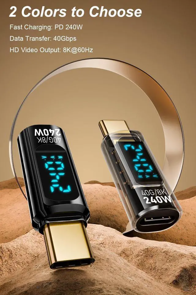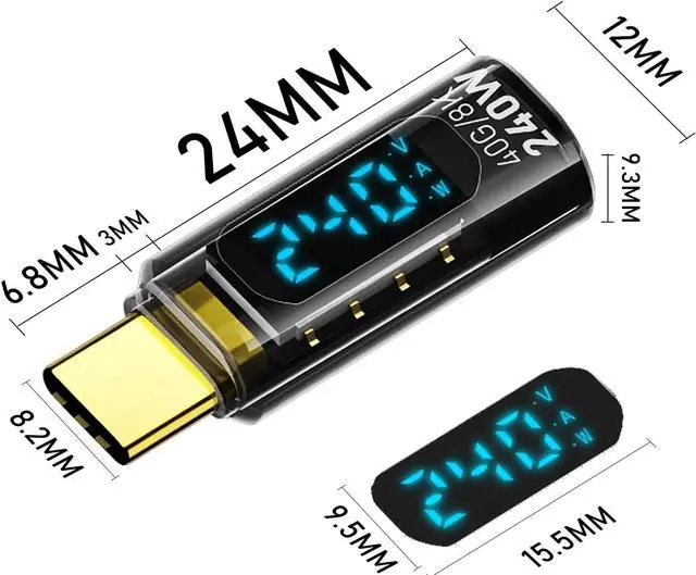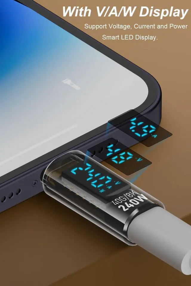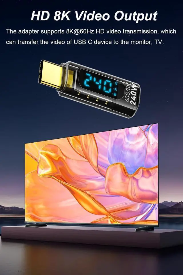 With V/A/W DisplayThe adapter with an LED digital display screen that can display charging voltage current and power in real time. It has a visual design that allows you to know the charging speed in real time and monitor device status. 240W PD Fast ChargingThe adapter can provide up to 240W(48V/5A) PD charging It will not reduce the original charging speed of your device. 40Gbps Data TransferThe USB C adapter complies with the USB 4 standard and supports 40Gbps data transfer allowing for faster transfer of movies music and more. HD 8K Video OutputThe adapter supports 8K@60Hz HD video transmission which can transfer the video of USB C device to the monitor