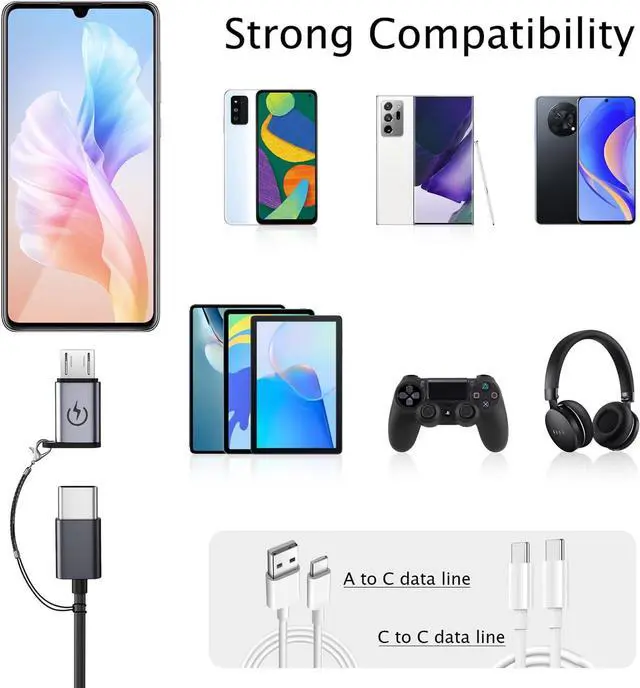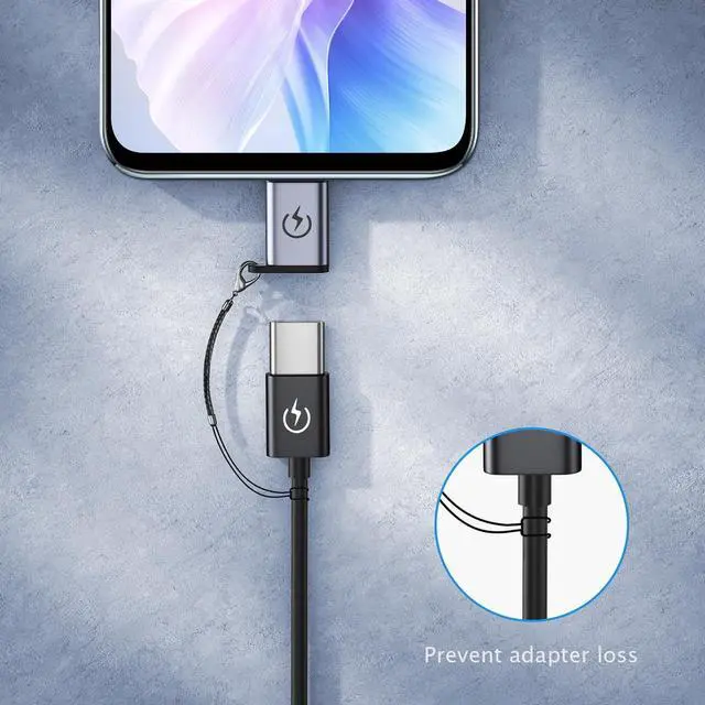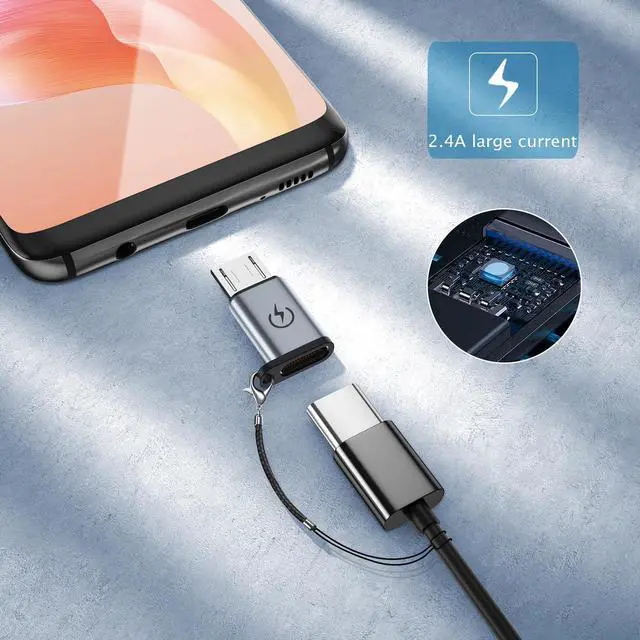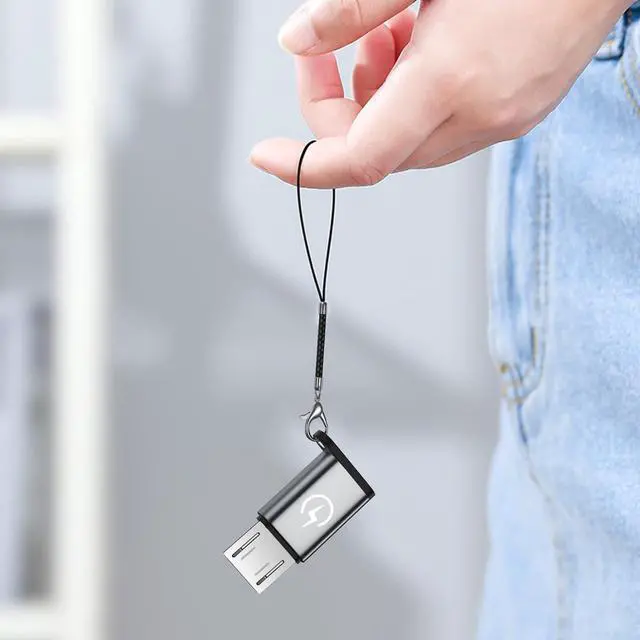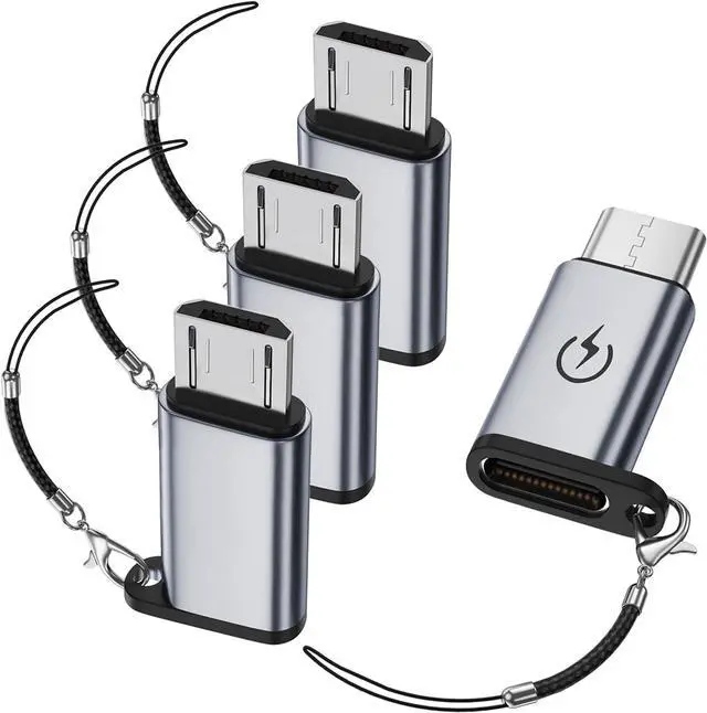 USB C to Micro USB AdapterWith this adapter you can easily connect to devices with Micro USB ports using USB C cable for charging and data transfer. Charging and Data TransferThe micro USB adapter supports up to 2.4A fast charging and supports 480Mbps(40-60MB/S) data transfer speed. Compact and durableUltra thin size ultra compact design durable aluminum shell. Plug and PlayThe adapter can be plugged and unplugged for up to 10000 times and it does not need to install any driver plug and play. Package ContainsUSB C female to micro USB male adapter x 4 Lanyard x 4.