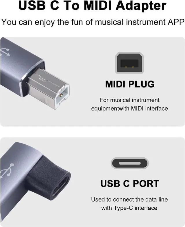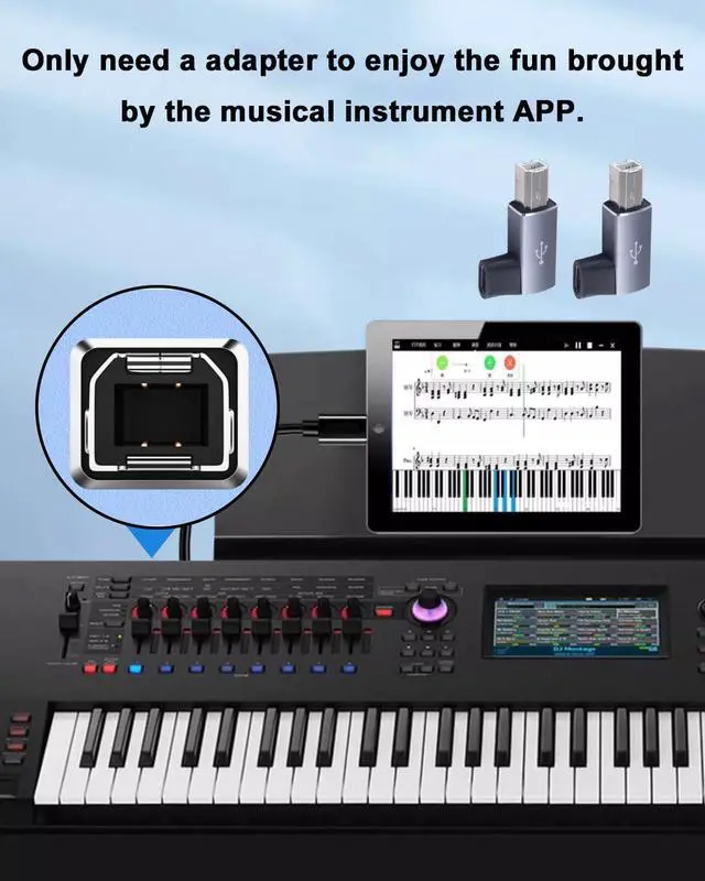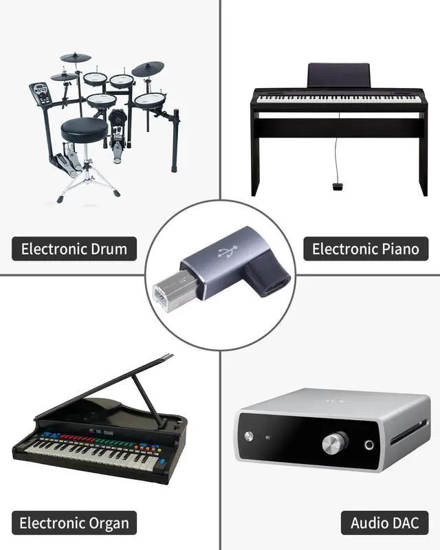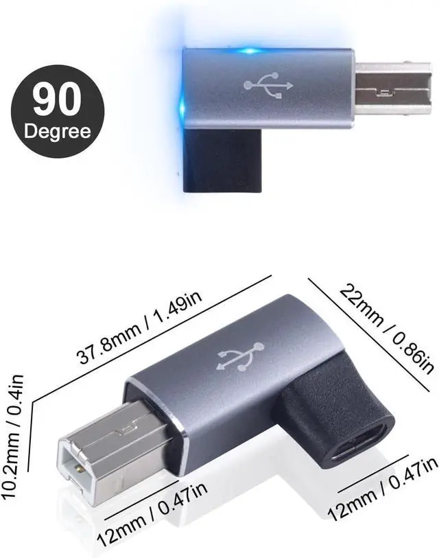 90Degree design is more flexible and space saving. Type C Female to Type B 90 Degree Adapter is plug and play no driver required. USB B interface is suitable for Printer Electric Piano Laptops and so on. USB C interface is suitable for instrument devices with MIDI interface. The shell of USB C Printer Adapter is made of aluminum alloy which have heat dissipation wear resistance and fingerprint resistance. so that you will not be burned when you take it off the device when you use it for a long time. USB B to USB C Adapter is suitable for USB B connectors that you can enjoy the fun of the musical instrument APP.