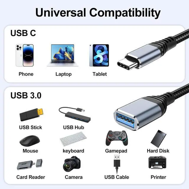 Wide CompatibilityThis USB-C to USB 3.0 Adapter compatible with all USB Type-C port devices including iPhone 17/17 Pro/17 Pro Max/Air/16e/16/16 Pro/16 Pro Max/15/15 Pro/15 Plus/15 Pro Max Macbook Pro 2020/2019/2018/2017/2016 Macbook Air /iPad Pro 2020/2018 Galaxy S25 S24 S23 S22 S21 S20 S20+ S20 Ultra Note 10/Note 10Plus/Note8 S9/S9 Plus S8/S8 Plus LG G6 G5 V20 Google Pixel 10/9/8/7 and most Type-C device.