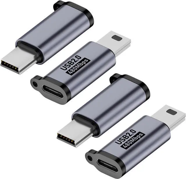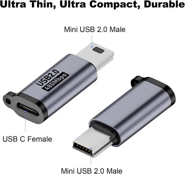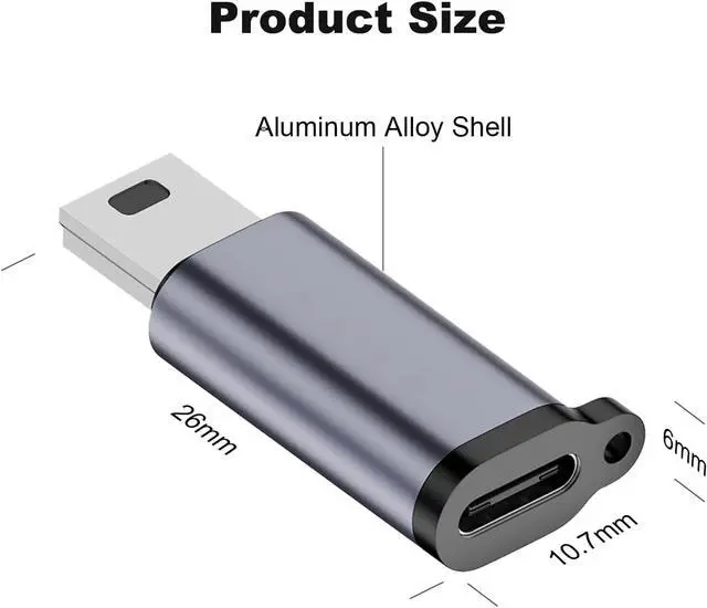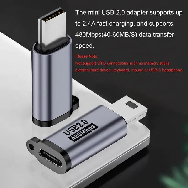 Mini USB to USB C AdapterThe adapter can convert your mini USB device to a USB-C female port so you can connect the USB-C cable to the mini USB device for charging and data transfer. Charging and Data TransferThe mini USB 2.0 adapter supports up to 2.4A fast charging and supports 480Mbps(40-60MB/S) data transfer speed. Small and portableUltra thin size ultra compact design durable aluminum shell fine appearance details and strict quality inspection standards. CompatibilityCompatible with PS3 controller Digital Cameras MP3 player Dash Cam GPS Receiver GoPro Hero HD Hero 3+ Astro A40/50 Zoom Mic and more devices with Mini USB port.