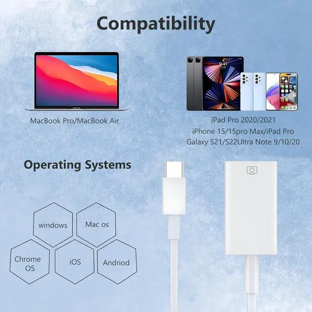 Easy to Share No APP required Plug and play you can easily share your photos to social media; or you can transfer file from U disk or memory card to your iPhone/iPad. Supports photos in JPEG and RAW formats SD and HD videos in H. 264 and MPEG-4 formatsWidely UsedOur adapter serves a multitude of purposes. It can be widely used with various USB 3.0 devices including digital cameras card readers USB flash drives MIDI keyboards mice U disks hubs electronic pianos drums audio interfaces mixers USB microphones and more. Discover endless possibilities with this versatile adapterWide CompatibilityThis USB C Male to USB 3.0 female adapter is compatible with Surface Book 2 Google Chromecast with Google TV iPad Pro 2020/2021/2022 Galaxy S23/S23+/S23 Ultra/S22/S22+S21/S21+/S21 Ultra/S20/S20+/S20 Ultra/S10/S9/S9 Plus/Note 10/Note 9 Google Pixel 7/7Pro/6/5/4/4XL/3/3XL LG Stylo 5 V40 Moto G7 Surface Book PixelBook Raspberry Pi 4 and More USB C Devices.