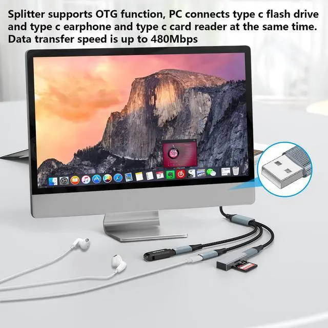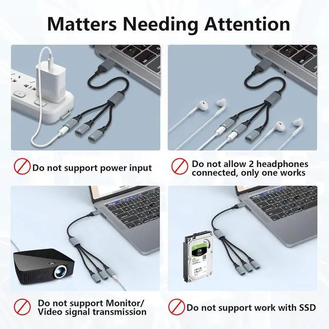 Pay Attention Before Purchase]: This USB A Male to USB C Female splitter is only designed for OTG and Data Transfer.? Not support video signal transmission such as monitor/HDMI/VGA cable.? Not support two headphones at the same time.? Not support work with A-pple MagSafe.? Not work with A-pple CarPlay.? Not support power input charge not charge laptop.? Not support work with SSD unable to drive[Wide