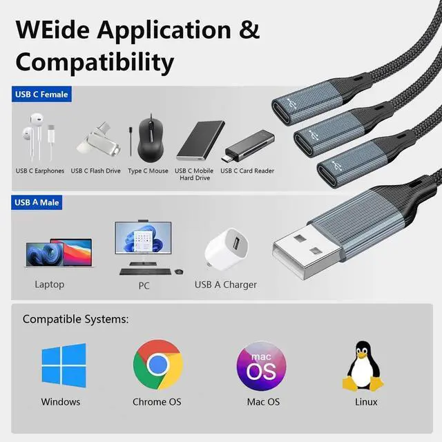 USB C Female Splitter]: This USB A to 3 USB C Female cable expands one USB A Female Port to three USB C Female Port on your USB A devices Allowing you connect three USB C peripherals to your devices simultaneously such as usb c headphone/usb c flash/usb c mouse[Please