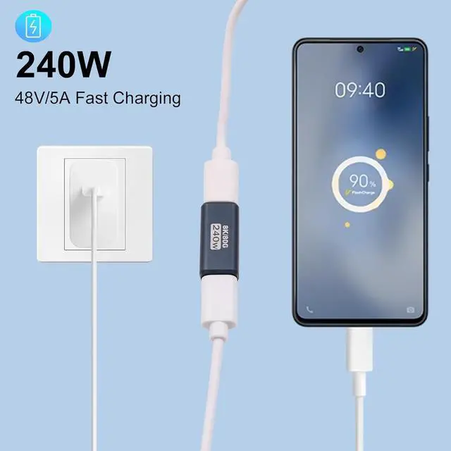 240W Fast ChargingThis usb c right angle adapter type c extender has 240W high power delivery for some power-hungry devices can support PD 3.1 fast charging and can meet all your charging needs. 8K Video & Bulit-in Emark ChipOur 8K usb type c extension adapter supports the 8K@60Hz Ultra HD and delivers precise color accuracy & sharp visuals for professional video editing graphic design and 4K/8K displays. And equipped with inner E-Marker chip for safety stability and battery protection. High-performance of charging for laptops tablets and other devices efficiently. Wide UseThis usb c extension adapter can fully compatible with USB4 Thunderbolt 4 Thunderbolt 3 such as MacBook M4 Pro/Max iPhone 16 iPad USB C monitors docking stations SSD.
