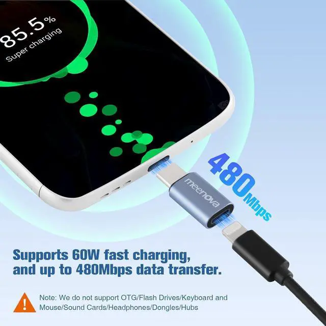 USB C Adapter]: Adapter for iPhone 16 charger Supports fast charging converter and data transfer charging up to 60W data transfer 480Mbps. It works with the original Type-C to Lightning cable. Compatible with PD QC and standard fast charging speeds.