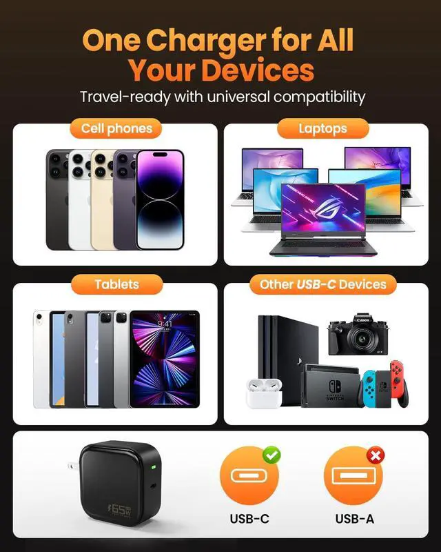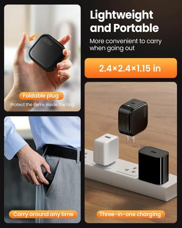 Includes a durable USB-C to USB-C cable (supports high-speed data & charging). Ready to use right out of the box for your USB-C laptop tablet or phone. Smart Power allocation detects your device's needs. Supports Super Fast Charging 2.0 (PPS 45W) for Galaxy S24 Ultra high-speed charging for iPhone 16/15 Pro Max iPad Pro Steam Deck and Nintendo Switch. Consolidate your travel kit to just one charger. [Travel-Ready & Foldable] The ultimate mobile power solution. Featuring a 90° foldable US plug and the included charging cord this compact block won't scratch your other devices.