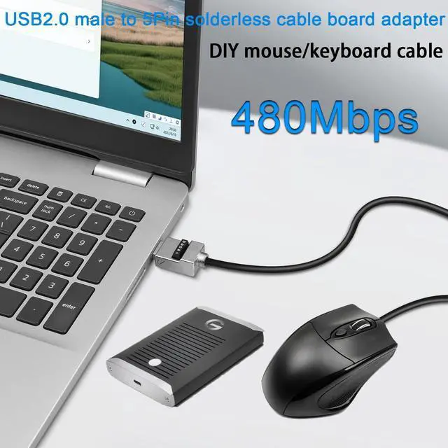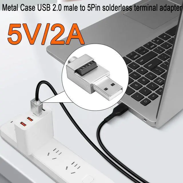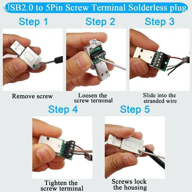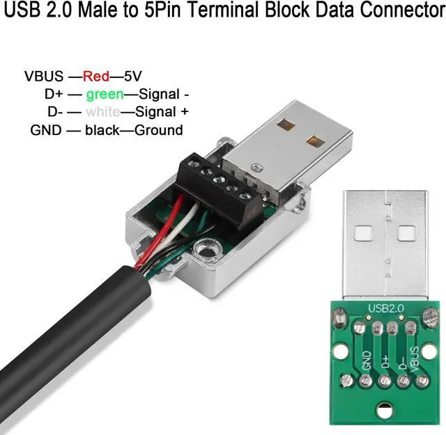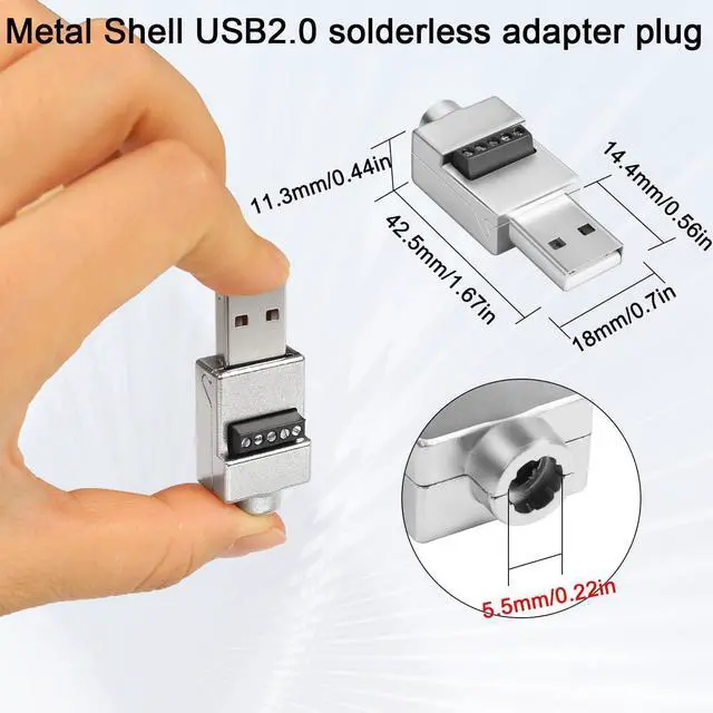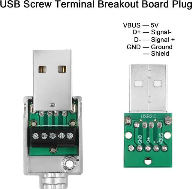 USB Repair or DIYMetal Case USB 2.0 male to 5Pin solderless terminal adapter. Solderless wire via screw terminals allowing you to DIY or repair USB 2.0 cable freely. Wiring wire gauge is 24-18AWG. Metal ShellUSB 2.0 to 5Pin Screw Terminal Solderless plug. Metal housing for solid ground protection. Adopts screw-locking shell for easy installation. Cable OD 5.5 mm/ 0.22 inData Transfer/ChargingUSB 2.0 male to 5Pin solderless cable board adapter. Support 480Mps data transfer or 5V 2A charging. WiringUSB 2.0 male solderless connector 5-pin pin wiring: VBUS (5V DC) D+ (signal -) D- (signal +) GND (ground). Unmarked pins (shielded). ApplicationMetal Shell USB 2.0 solderless adapter plug. Used for USB 2.0 data cable USB 2.0 charging cable and keyboard mouse printer and other USB cable repair.