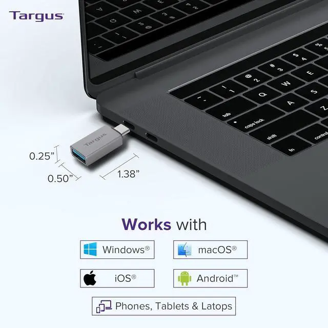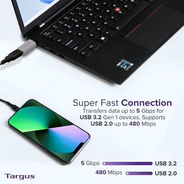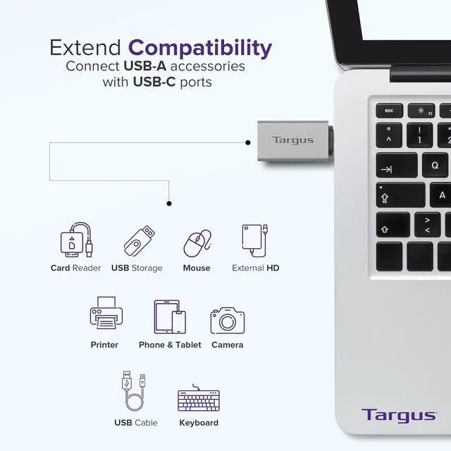 COMPATIBILITY - This Targus USB-C to USB-A adapter 2-pack allows you to connect your USB-A peripherals to your devices with USB-C ports making it an essential accessory for those who need to work across multiple platforms. HIGH-SPEED TRANSFER - With support for USB 2.0 (480 Mbps) and USB 3.2 Gen 1 (5 Gbps) devices this USB-C to USB-A adapter ensures seamless syncing and powering of your peripherals; mouse keyboard or flash drive with a maximum power output of 3.0A. SLEEK DESIGN - The adapter features a sleek aluminum housing that not only adds durability but also a modern touch to your tech accessories.