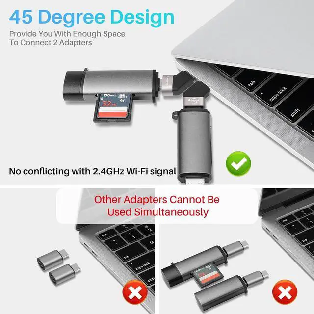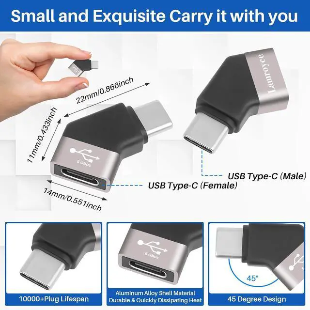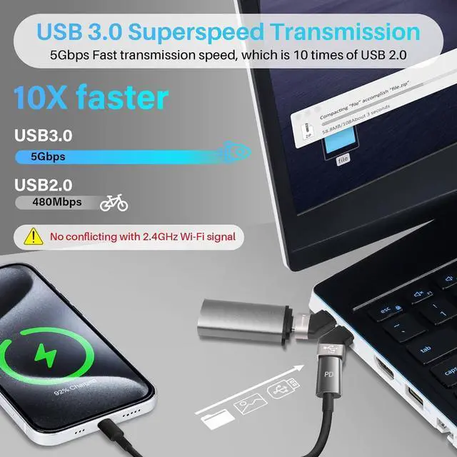 Side by side use: This USB C male to female adapter features a 45 Degree diagonal design which ensures space to insert both adapters into the USB-C port of the MacBook Pro side by side without interfering with each other and avoiding blocking other device ports. 5Gbps High