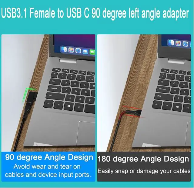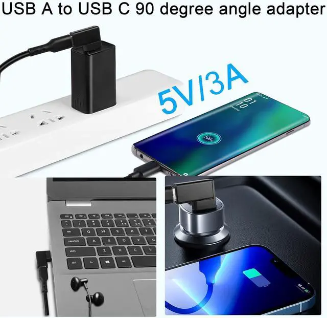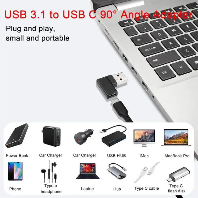 90° left angle90 degree angle USB A male to USB C female adapter. Ideal for PCs laptops or tight spaces near walls. Avoid wear and tear on cables and device input ports. UseUSB 3.1 to Type C converter. Connect USB C cables USB C hubs USB C mice USB C keyboards and other USB C devices to USB ports on laptops/tablets/wall chargers.
