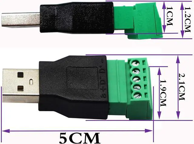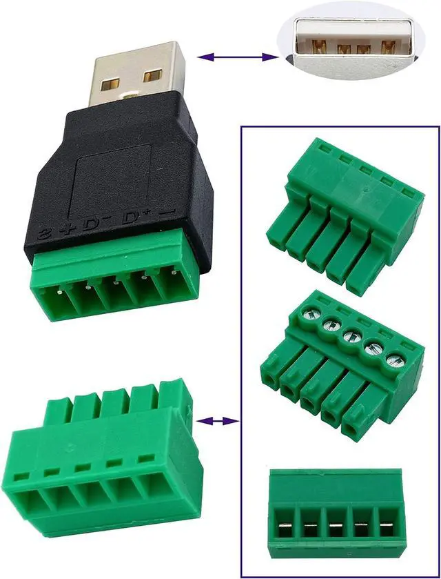 Applicable Equipment: This USB 2.0 A adapter is available for charging and data transfer. This terminal is wired in accordance with the USB 2.0 A wiring standard for structured cabling Can extend the length of the USB cable 5-pin (way) bolt screw terminal pluggable connector can be plugged into the USB plug Then connect the socket to the other wires The length of the USB cable can be extended.