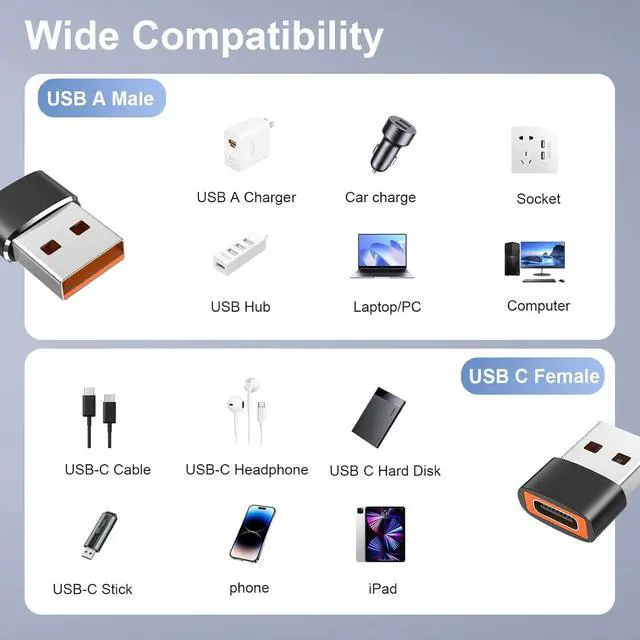 Upgrade Your USB A ChargerEliminate the hassle of unused USB-A chargers. This USB A to C adapter reinvigorates your current setup. Just plug it in to convert any standard USB-A port into USB-C charging solutionno more wasted chargers or cluttered drawers. Fast Charging and Data TransferThis type c adapter supports fast charging (up to 6A) and data transfer speeds of 480Mbps for swift file transfers.?