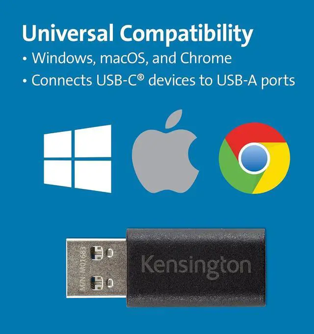Connects newer USB-C devices (phones cables headsets hard drives and more) to any availableUSB-A port on your laptop docking station or charger. Works with Windows macOS and ChromeA simple plug-and-play solution for connecting your USB-C devices to your USB-A portsno drivers ordownloads required20x faster than most adapters the CA1020 enhances your productivity with up to 10Gbps data transferspeedsProvides consistent power to USB-C accessories. Ideal for connecting USB-C phones or headsets toUSB-A laptop ports wall chargers and portable battery packsThe CA1020 is a high-quality accessory backed by a two-year limited warranty. Rest assured knowingyoure covered by Kensington