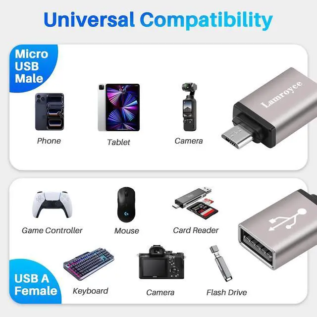 USB Adapter: This micro adapter is compatible with most devices with USB to Micro USB. Perfect for connecting keyboard game controller (PS3 PS4 etc. ) USB Headphones flash drives SD/TF card reader wireless mice and more.
