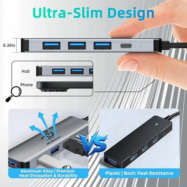 Note: The Type-C power port is for power supply only and does not support data transfer. 5Gbps High-Speed Data Transfer Equipped with 1 USB 3.0 high-speed port (located next to the Type-C power port) that supports simultaneous data transfer and device charging. Delivers transfer speeds of up to 5Gbpsperfect for large files photos and videos. Also includes 480Mbps USB 2.0 ports and a 5V/2A Type-C power port for stable everyday use. Durable & Stylish Aluminum Alloy Design Made with premium aluminum alloy for excellent heat dissipation and durability. Comes with a dust-proof protective cap for the USB-A input port to prevent dust and wear when not in useextending port lifespan. The built-in soft blue LED indicator shows the working status in real time without being harsh on the eyes making it ideal for frequent and long-term use. Wide Compatibility & Portable Design Compatible with laptops and desktops with USB-A ports (such as XPS) PS4 Xbox and more. Supports Windows ChromeOS and Linux systems. Perfect for solving limited-port issues the compact and portable design is great for travel remote work or daily use.