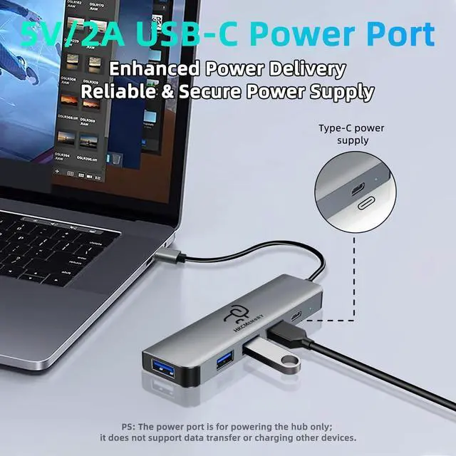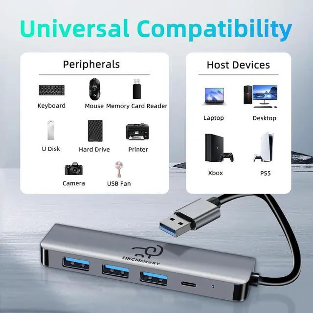 Multifunctional USB 3.0 Hub The HKCMEMORY 5-in-1 USB 3.0 multiport adapter features 1 × USB 3.0 port 3 × USB 2.0 ports 1 × USB-C data port and 1 × Type-C power port. Backwards compatible with USB 2.0 / 1.1 its ideal for connecting flash drives mice keyboards printers and other peripherals. No driver requiredsimply plug and play. allowing connection of multiple devices simultaneously for more efficient work. With Type-C Power Delivery Supports 5V external power input to supply additional power to the hub for enhanced transmission stabilityespecially useful when connecting high-power devices such as printers or large-capacity hard drives.