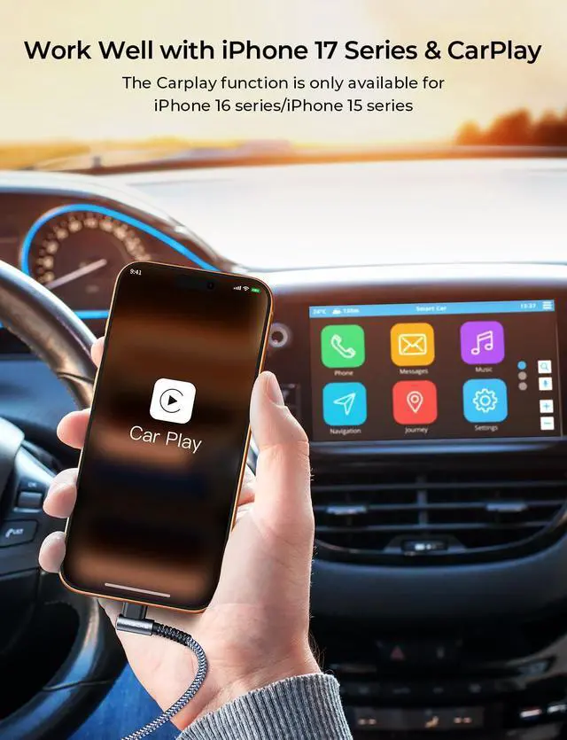 Widely Compatibility: This car carplay cable connects and perfect compatible with your iPhone 17/17 Pro/17 Pro Max/Air/16e/16 Plus/16 Pro/16 Pro Max/16 iPhone 15/15 Plus/15 Pro/15 Pro Max iPad Pro 13-inch 12.9 -inch 11-inch iPad Air 6th/5th/4th Gen iPad Mini 6th Gen TV Remote (3rd Generation) and the car carplay cord also for Google LG Moto Android Phones/Auto and more.