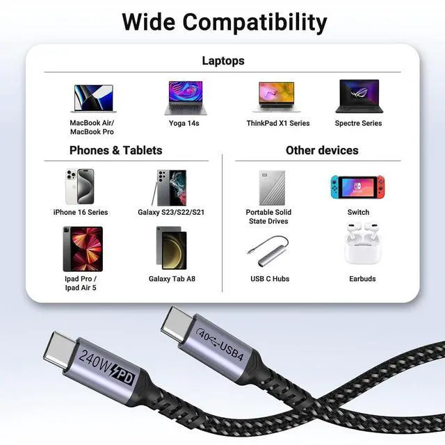 DP Alt Mode)[Compatibility]: the short usb 4 cable is compatible with iPhone 16/16 Pro/16 Plus/16 Pro Max iPhone 15/15Plus/15Pro/ Max MacBook Pro iPad Pro Galaxy S23 Pixel LG[What You Get]: 2 Pack 1.5 FT usb c cable 240W with SUMPK all life technology support