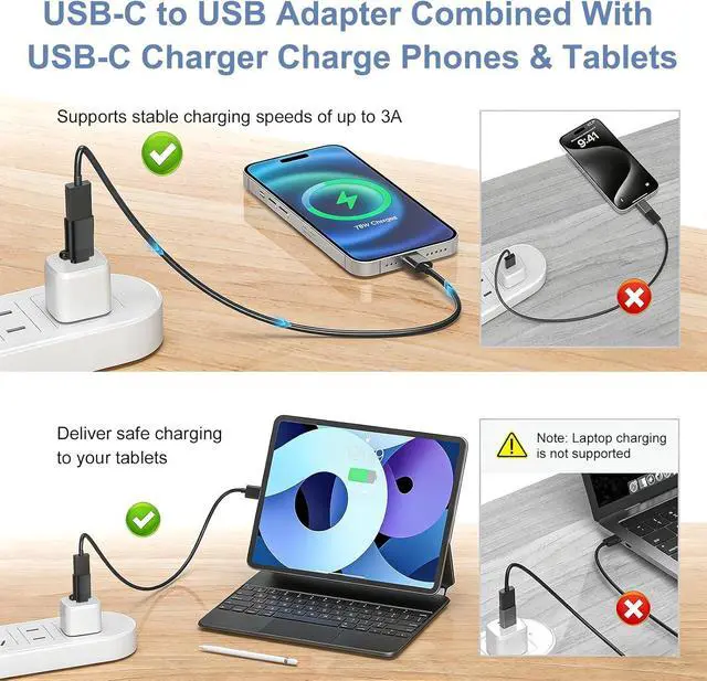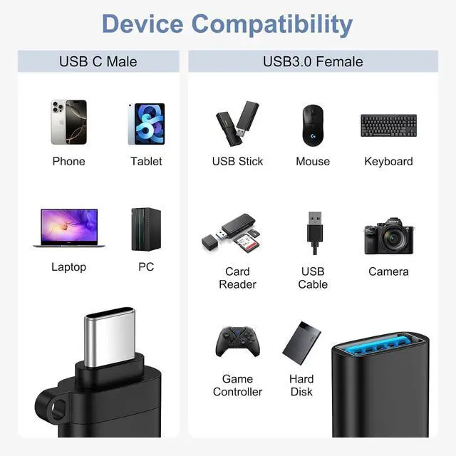 USB C Devices: This USB C to USB adapter is compatible for all USB-C devices including phones tablets and laptops. Using USB-C to USB Adapter you can connect standard USB-A accessories/cables to USB-C or Thunderbolt 4/3 devices such as iPhone 17e 17 Pro Max 17 Pro 17 Air 16e 16 15 series; Galaxy S26 Ultra S26+ S26 S25 Ultra S25 FE S25 Edge S25+ S25 S24S23 S21; Macbook Pro /Air2025 2024 2023 2022 2020 USB C port Laptop HP and any USB-C device.