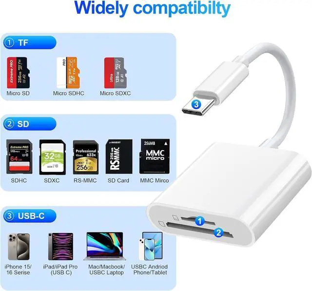 Just Plug and you can transfer photos/files from memory card or USB compact flash to your USBC device anytime and share your moments with friends at the first timeWidely Compatible with USBC DeviceDenlane SD card to usbc adapter compatible with iPhone 15 16 series/ipad/ipad pro/mini/air with USB-C interface for MacBook Pro/Air/iMac also compatible with /Galaxy//Thinpad and other Android phone/tablets/laptop with USB-C Type C connectorSD/Micro SD Card Viewersd micro sd card reader usb c allows you to view multiple types of SD/TF/SIM cards easily anytime and anywhere. Compatible with SD SDHC SDHC SDXC Micro SD Micro SD Micro SD Micro SDHC Micro SDXC cardAbout DenlaneWe are committed to growing as a quality global brand we support the warranty within 365 days if you have any problems please let us know and we will do our best to solve them for you!
