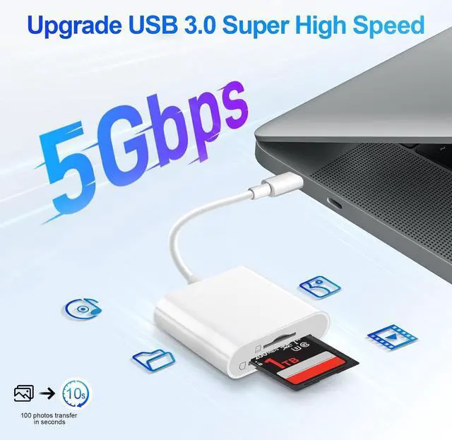 2025 Lastest Chip USB 3.0 Speed UpgradeDenlane new releases sd card reader with 5Gbps high speed reading and uploading which is 10 times faster than most of the USB 2.0 memory card readers on the market. You can easily transfer hundreds of photos in seconds saving your timeWith MFi Certified Specialty Choices for PhotographersDenlane digital trail camera memory card adapter allowing you to instantly see the best moments of your shots! Support transfer files/photos/music/video from sd card to your usbc device and enables bi-directional transfer and helps free up storage space. This is a useful accessories for photographersPlug & Play Travel SizeDenlane SD card reader usb c with built-in usbc connector is easily to use no APP no network no driver no extra power.