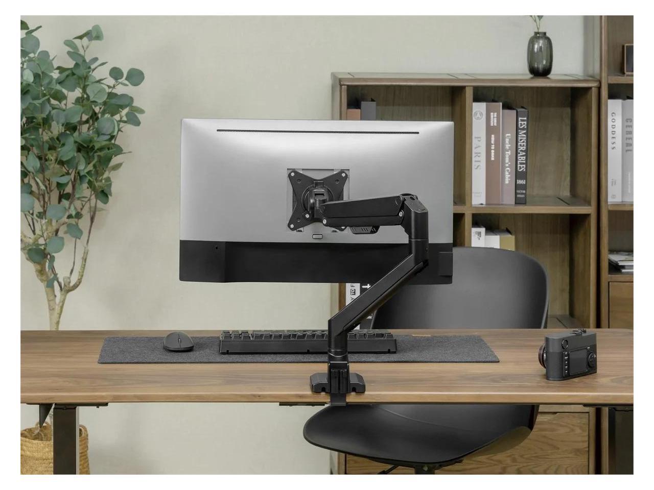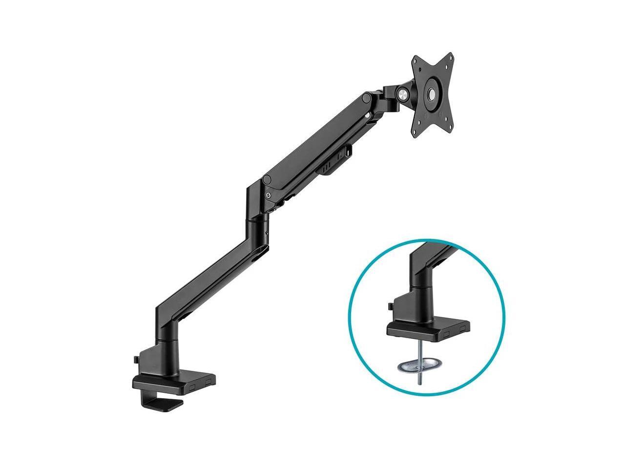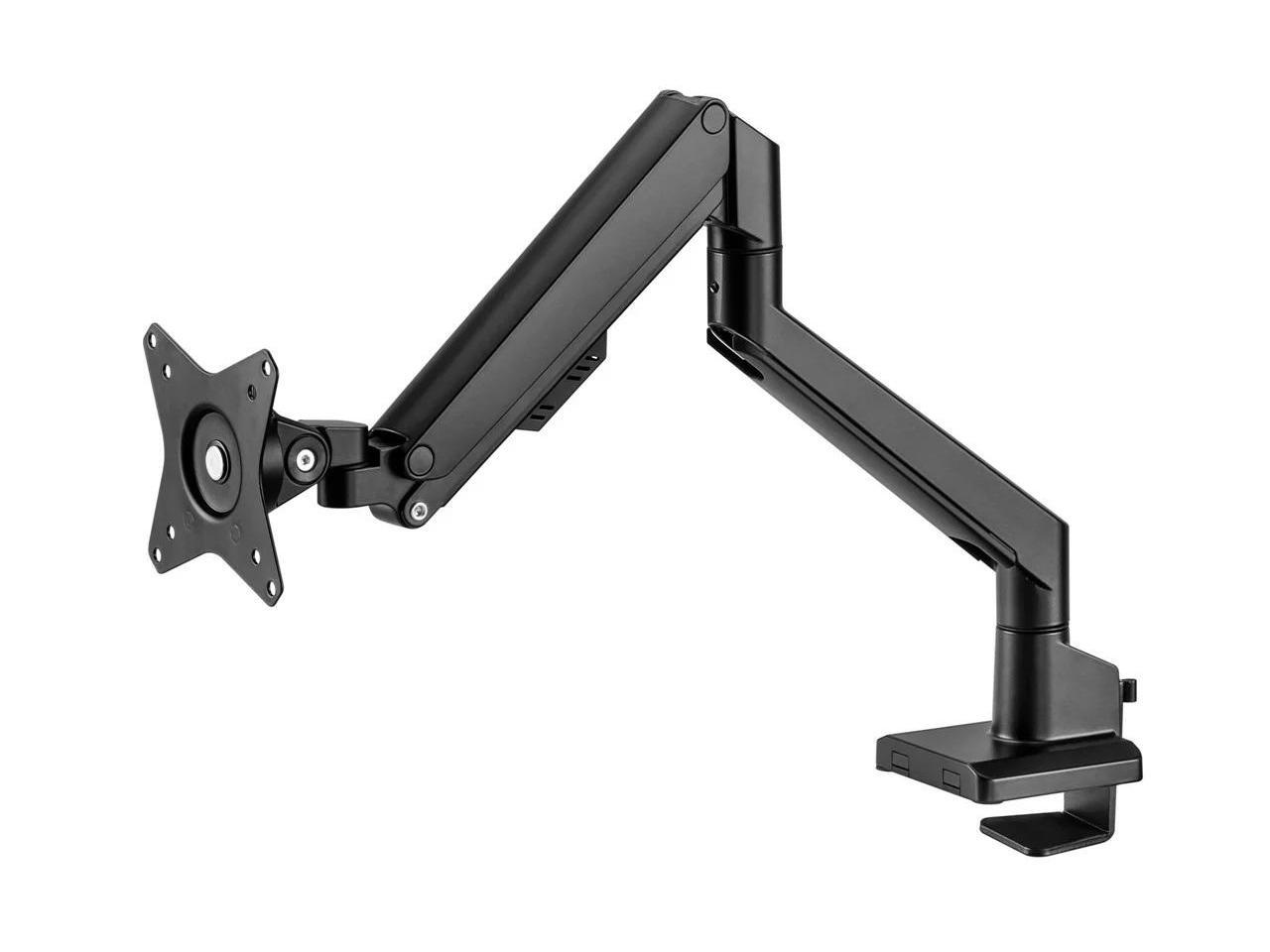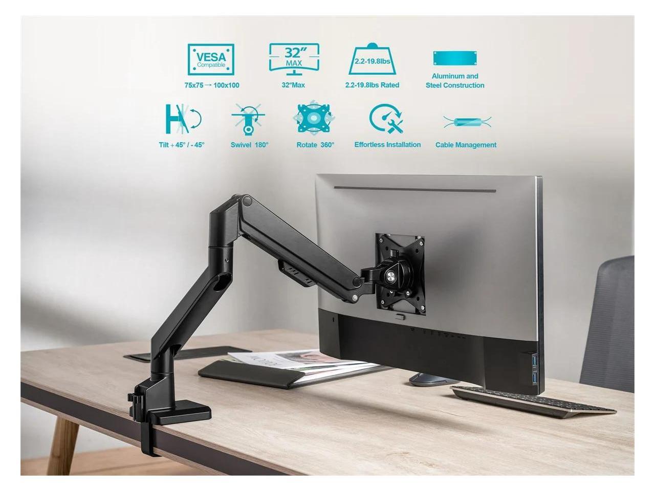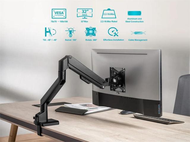 - Supports monitors up to 32 inches and 19.8 pounds for versatile compatibility|Detachable VESA mount plates (75x75 and 100x100) enable quick and easy installation|Counterbalanced gas-spring arm provides smooth, effortless monitor adjustments|Durable construction with high-grade aluminum and steel ensures long-lasting use