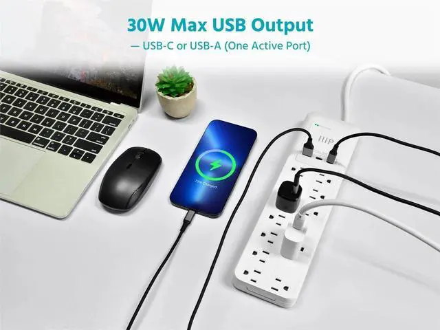 Designed for todays digital lifestyle, the 12Outlet Surge Protector Power Strip isnt just a power stripits a comprehensive charging hub. With twelve AC outlets, two USBC ports, and one USBA port, you can charge multiple devices simultaneously without the clutter of extra adapters. The integrated USBC Power Delivery (PD) ports deliver up to 30W of fast chargingideal for smartphones, tablets, laptops, and other USBpowered devices. Whether youre streaming, gaming, working, or relaxing, your devices stay powered and protected all day long.