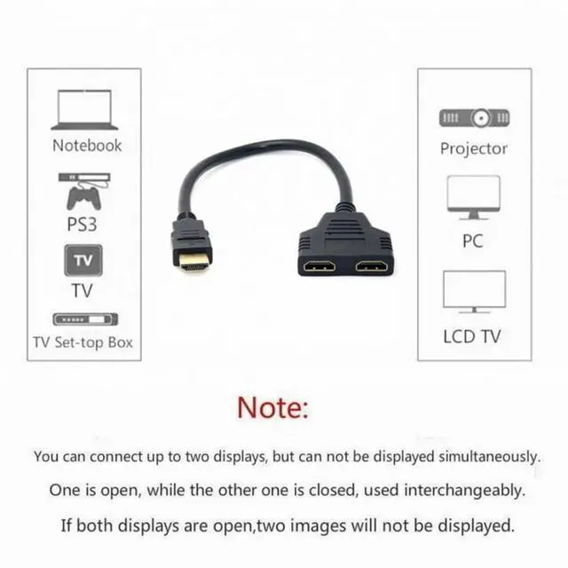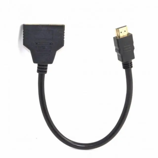 HDMI Male to 2 HDMI Female Adapter replicates single output into two outputs.