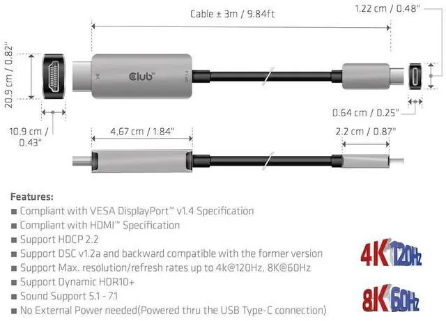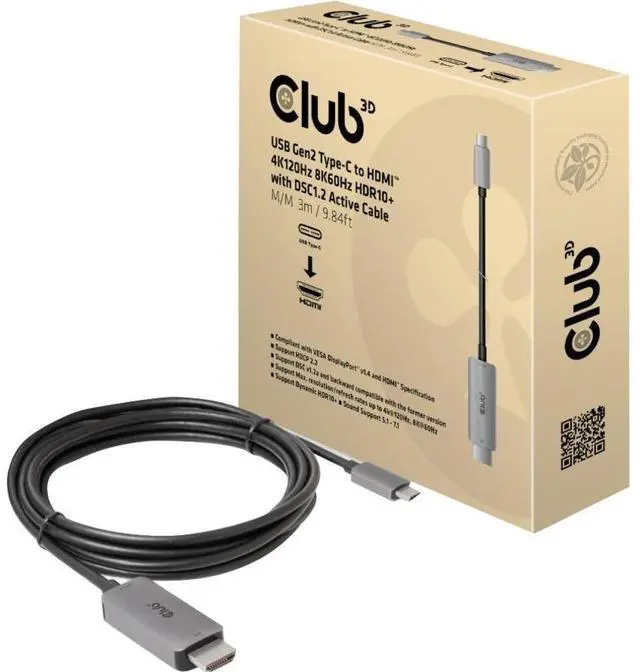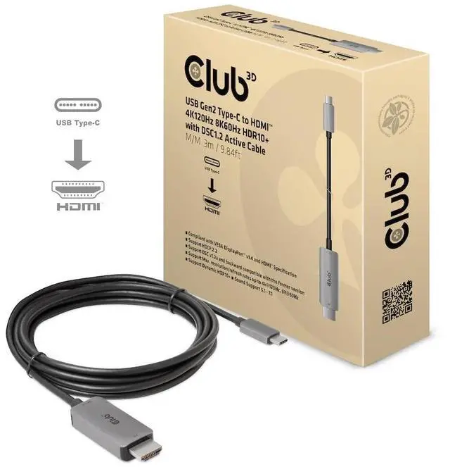 The Club 3D CAC-1587 USB Gen2 Type-C to HDMI (tm) 4K120Hz 8K60Hz HDR10+ with DSC 1.2 Active Cable M/M 3m/ 9.84 ft., is the perfect solution to connect to any HDMI (tm) 8K60Hz or 4K120Hz ready display. In case you have a DisplayPort (tm) Alt Mode 1.4 ready PC with a USB Gen2 Type-C connection or any other device that lacks the new HDMI (tm) 8K60Hz or 4K120Hz specification, the Club3D CAC-1587 will be the simple way to upgrade your device and connect to your new TV. With its DP 1.4 Alt Mode DSC video compression technology, this Cable is able to convert DP 1.4 Alt Mode video signals to HDMI (tm), supporting video display resolutions up to 8K (7680 x 4320) @60Hz and creating life like colors and movements with HDR10+ giving users the ultimate visual experience.