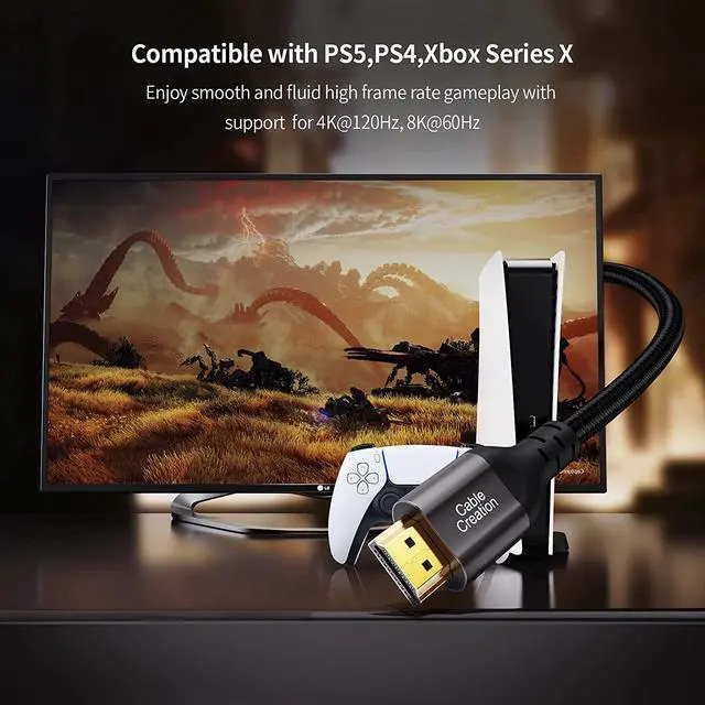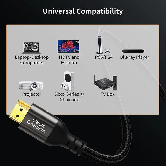 Wide ApplicationThe 8K HDMI 2.1 cable is compatible with LG TV, QLED TV, Roku, Sony 8K UHD TV, PS5, PS4,Series X,Tivo, Vizio, Laptop, PC, RTX?3080, Projector,etc. 24-month product replacement warranty and lifetime friendly technical support. Any question, please feel free to contact us for help first.