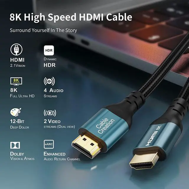 Top Technology8K HDMI 2.1 CableHDMI 2.1 version supports higher video resolutions and refresh rates including 8K@60 Hz and 4K@ 120Hz / 60Hz, 1080P, also compatible with HDMI 2.0b/2.0a/2.0/1.4/1.3/1.2/1.1 version. With 8K HDMI's unique Dynamic HDR and 12 Bit color processing technology, each scene of the video is every frame, with more ideal depth, brightness, detail, contrast and wider color gamut, giving you an amazingly viewing experience.
