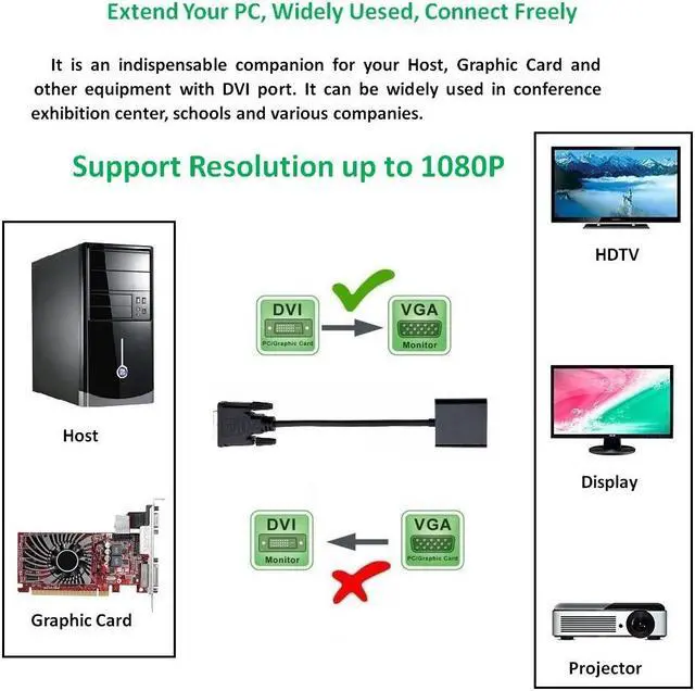Easy to Use - Golvery Active DVI to VGA Converter can be used to connect a video graphics card or PC with DVI-D Dual Link 24+1 output (Compatible with DVI-I Dual Link 24+5 as well) to a projector or monitor with VGA input (Single-way). An extra VGA cable is required to connect the adapter to your display. No driver or software installation required. High Performance - Converts a digital DVI signal to an analog VGA signal; Integrated chipset improves the compatibility with more VGA displays; Sturdy DVI VGA cable adapter is fully shielded and engineered with molded strain relief and gold-plated connectors for reliable signal transmission and durability.