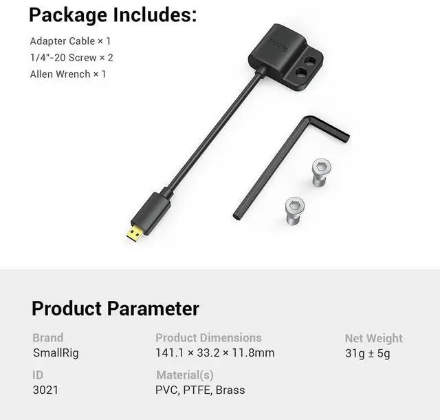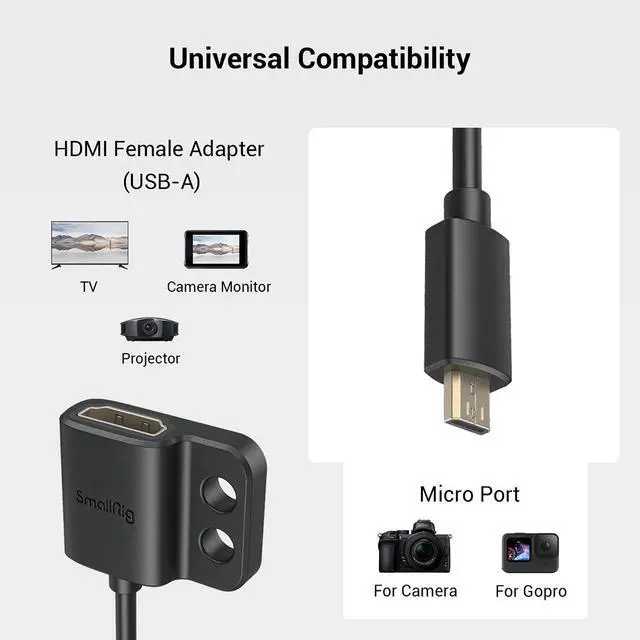 SmallRig Ultra Slim 4K HDMI Adapter Cable (D to A) 3021 is a high-quality HDMI adapter cable (Micro HDMI Male to Full HDMI Female) for your camera setup. It's HDMI 2.0 version and supports resolution up to 4K@60HZ and will be backward compatible. It features two 1/4-20" screws to fix the female part to the side of the camera cage or L bracket tightly to protect the camera's HDMI port and ensure a more stable connection. Ultra-slim design with 3.6 mm outer diameter makes it thinner and softer than a regular HDMI cable. It's a perfect adapter cable used to change the camera HDMI port to a more desired direction as needed.