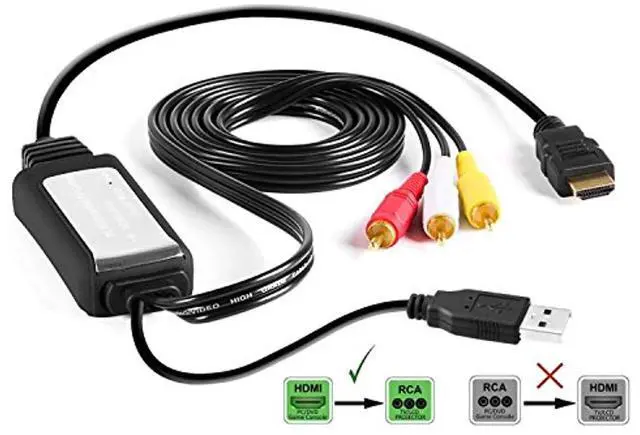 hdmi to rca converter cable - convert digital hdmi signal to analog av - compatible with ps4/xbox one/nintendo switch/pc/bluray and more - hdmi to av converter - easy to useFeatures: - Built in HDMI to RCA Converter Chipset for Convenience- High Quality Cable and Converter for High Performance and Long Life- Compatible with All Your HDMI/RCA Devices-IMPORTANT:This product requires power. The built in USB cable needs to be connected to a USB power source. If your device does not have an available USB port to connect it to, you would need to use a USB power adapter for this cable to convert digital to analog signal.Product Specifications:Cable Gender: HDMI Male, RCA/AV/Composite MaleOutput: HDMIInput: RCA/AV/CompositeCable Color: BlackRCA Colors: Red/White for Stereo Sound, Yellow for videoWeight: 5 ouncesProduct Length: 6.5 feetWhat's in the box? 1x: HDMI to RCA Cable30 DAY MONEY BACK GUARANTEE - Purchase your HDMI to RCA Converter Cable and If you are not satisfied send it back within 30 days for a full refund - No questions asked - Click on "Buy now with 1-Click" or "Add to Cart" to own one now before we run out