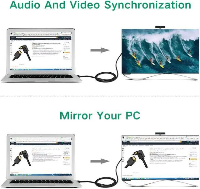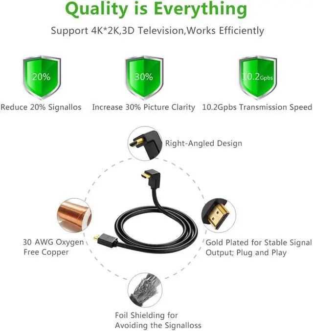 Right Angle HDMI Cable: right angle design makes the cable better fits for wall-mounted devices, solving the embarrassment of limited spaces between wall and device. Supports 4K, 1080P Full HD, 3D, Ethernet Channel, 48-Bit Deep Color and Audio Return Channel (ARC), audio video sync, HDCP compliant.