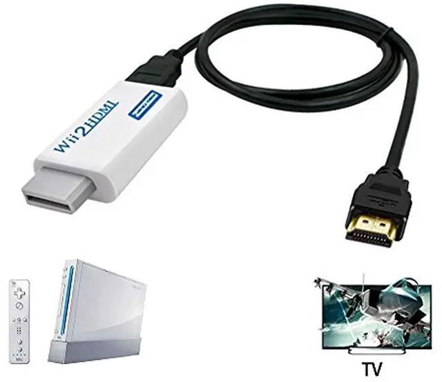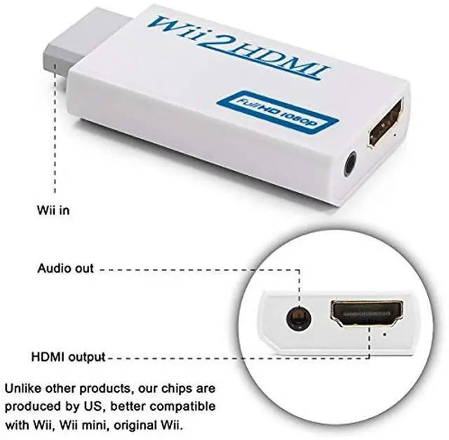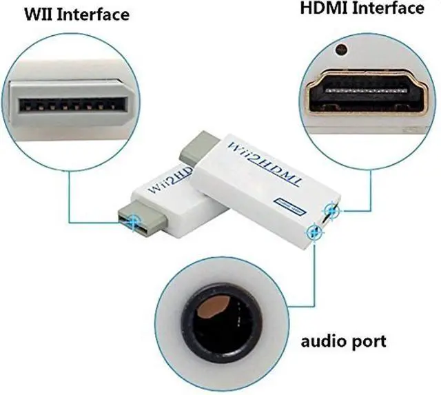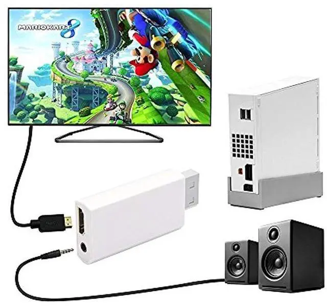 3.Wii to HDMI Adapter no power adapter, no messy cords — just one HDMI cable. Audio embedded in HDMI, also passes through to 3.5mm jack. Hassle Free! Plug and play